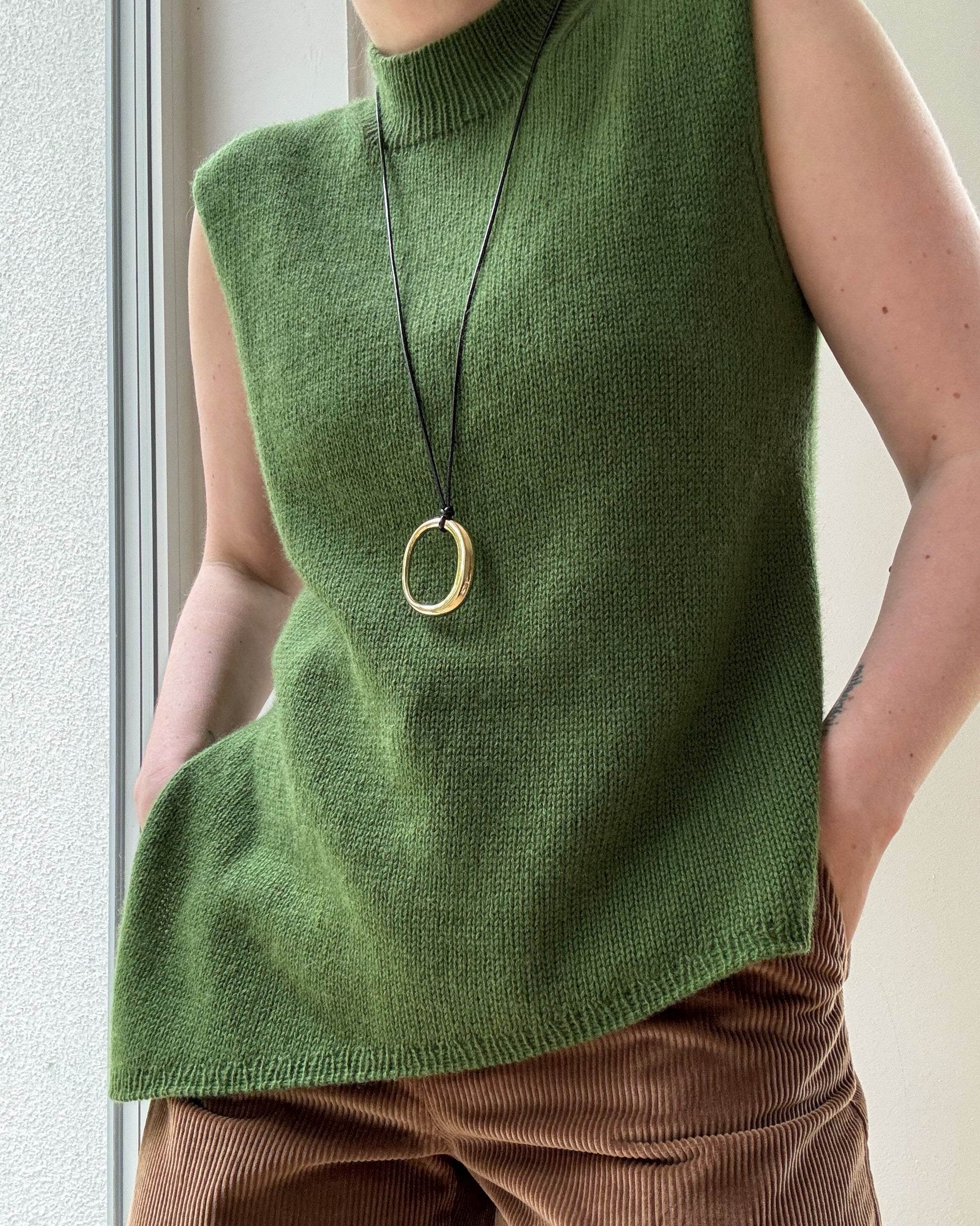 Das Liv Top wird von oben nach unten glatt rechts gestrickt, angefangen mit dem linken und rechten Rückenteil, die mit verkürzten Reihen geformt werden. Dann werden Maschen für den Halsausschnitt angeschlagen und die Rückenteile verbunden, um den Rücken in einem Stück weiterzustricken. Anschließend werden Maschen für das linke und rechte Vorderteil aufgenommen, die einzeln mit Zunahmen für den Halsausschnitt gearbeitet, danach zusammengefügt und in einem Stück weitergestrickt werden. Sobald Vorderteil und Rückenteil fertiggestellt sind, werden Maschen für die Armausschnitte angeschlagen und der Körper wird bis zum Saum in der Runde gearbeitet. Der Saum wird in Hin- und Rückreihen beendet, um Schlitze zu erzeugen. Dann werden um den Halsausschnitt herum Maschen aufgenommen, um einen Stehkragen im Rippenmuster zu stricken. Für einen sauberen Abschluss wird zum Schluss entlang der Armausschnitte ein I-Cord angestrickt.