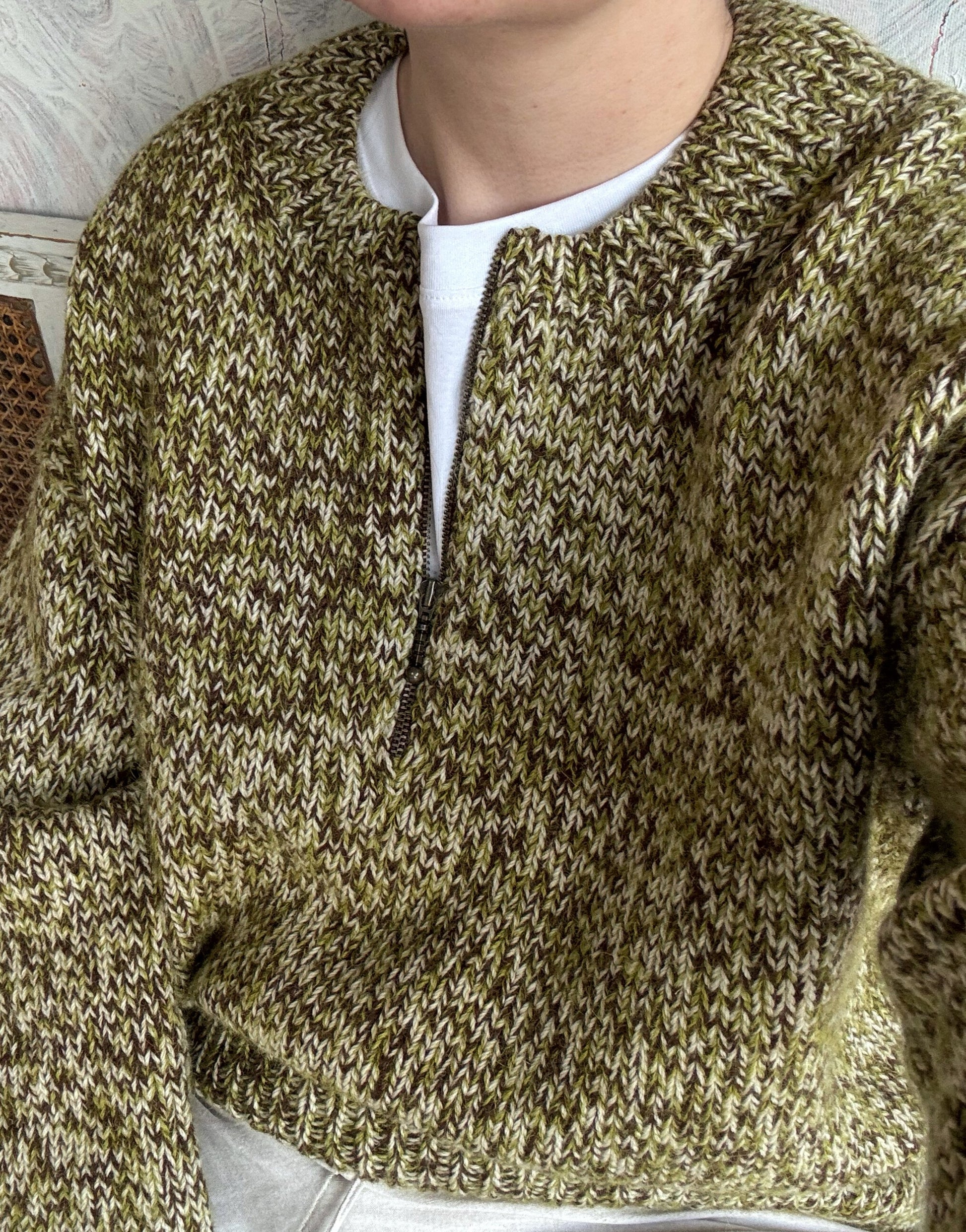 Der Luna Zip Sweater wird von oben nach unten glatt rechts gestrickt, mit drei Garnfäden in unterschiedlichen Farben, die zusammen gehalten einen einzigartigen Melange-Effekt erzeugen. Der obere Abschnitt des Rückens wird in Reihen gestrickt, dabei formen verkürzte Reihen den Halsausschnitt und die Schulterschrägungen, durch Zunahmen entsteht die Form der Armausschnitte. Dann werden Maschen aufgenommen, um das rechte und linke Vorderteil einzeln zu stricken und dabei eine Öffnung für den Reißverschluss zu bilden. Nachdem die Vorderteile und das Rückenteil fertig sind, werden sie verbunden und der Körper wird bis zum Saum in der Runde weitergestrickt. Entlang der Armausschnitte werden Maschen aufgenommen, um die Ärmel in der Runde zu stricken. Der Halsausschnitt wird in Reihen im 1x1-Rippenmuster fertiggestellt und versteckte Blenden entstehen, die die Reißverschlussleiste bilden, wo am Ende der Reißverschluss eingenäht wird.