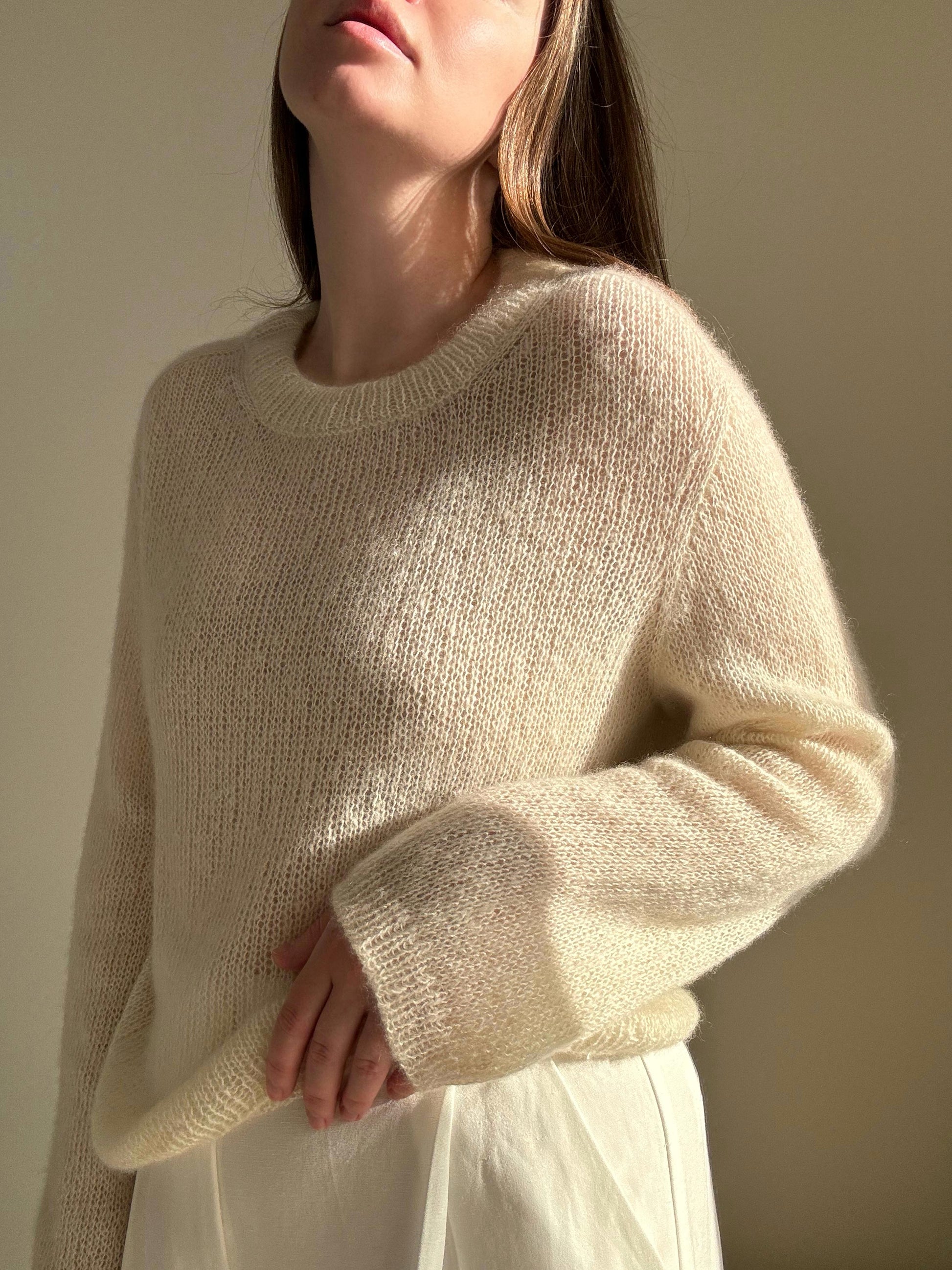 미카엘라 스웨터는 탑다운으로 작업하며 요크 부분부터 시작합니다. 등과 넥라인의 완벽한 핏을 위해 경사 뜨기를 사용하여 모양을 잡습니다. 그 후, 앞판과 뒷판을 각각 작업합니다. 그리고 앞판과 뒷판을 연결한 뒤, 원통으로 계속 뜹니다. 소매 부분 작업을 위해 암홀 부분에서 코를 줍습니다. 마지막으로 넥라인을 완성하기 위해 코를 주워 원통으로 작업합니다.