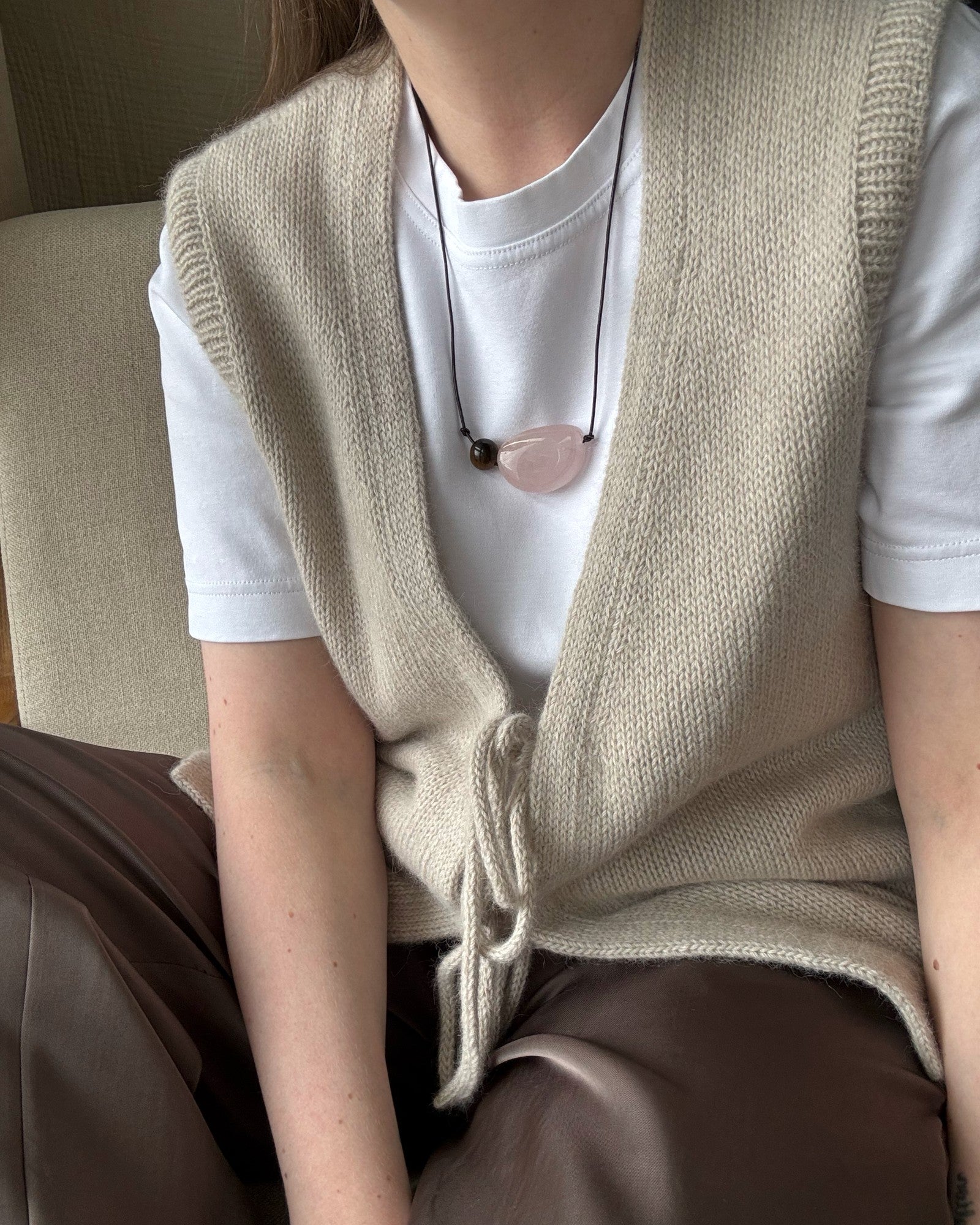 Le gilet sans manche Solene Vest se travaille de haut en bas, en maille jersey. On commence par les demi-dos gauche et droit, qui sont tricotés séparément. Les rangs raccourcies à l’allemande façonnent les épaules pour un meilleur ajustement au niveau de celles-ci. Après avoir monté les mailles au niveau de la nuque, les deux demi-dos sont joints puis le dos est travaillé en une seule pièce. Ensuite, des mailles sont relevées au niveau des épaules pour travailler les demi-devants gauche et droit, séparément, à l’aide d’augmentations afin de façonner l'encolure en V. Une fois les demi-devants terminées, des mailles sont montées aux bas des emmanchures, et le travail est joint puis travaillé en allers et retours. Des mailles sont ensuite relevées autour des emmanchures et le bord-côte de l’emmanchure se travaille en rond et en côte 1x1. Puis, des mailles sont relevées pour travailler la bande de boutonnage en jersey double. Pour finir, des cordelettes sont travaillées selon la technique du I-cord puis cousues à la bande de boutonnage.